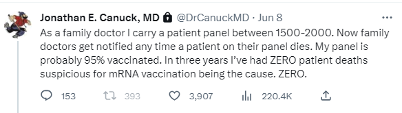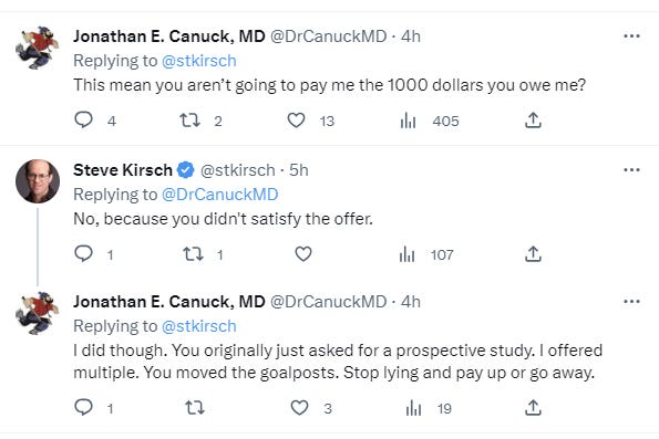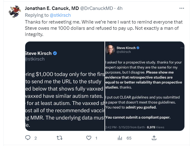 Since leaving my job in high tech, I make money on people accepting the bets and losing. These are large bets, on the order of $1M. False and defamatory statements like this from a medical doctor tarnish my reputation making it more difficult for me to earn an income. Canuck has a large following of people (17K) who trust him making his statements even more damaging.