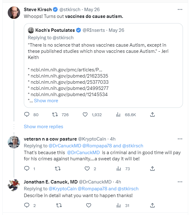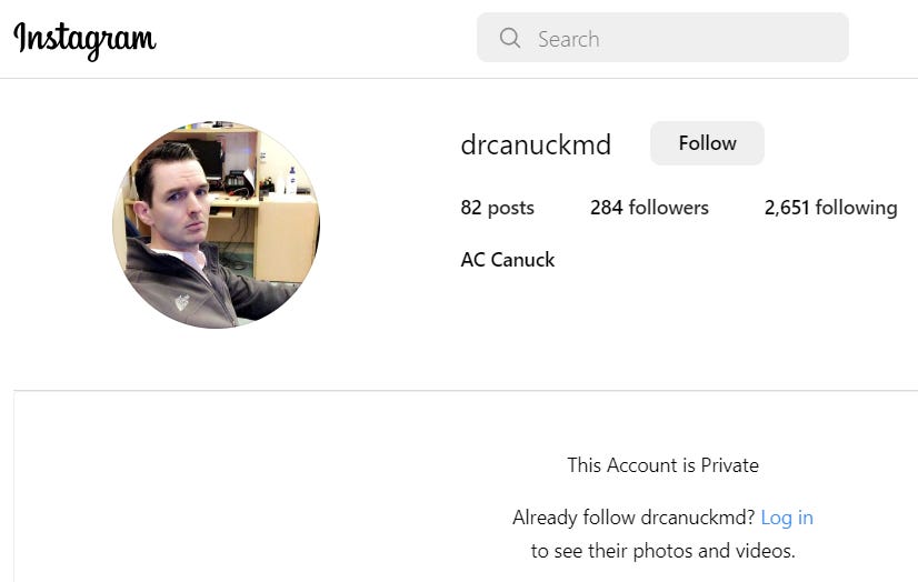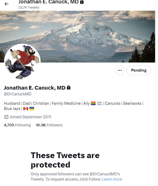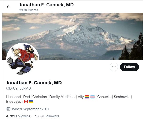 Dr. Canuck has a real name and a medical practice near Portland, OR and he needs to be held accountable for his defamatory statements. In addition, I may also report him to his medical board as most have rules governing behavior on social media.
