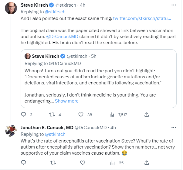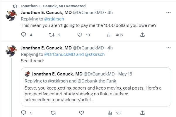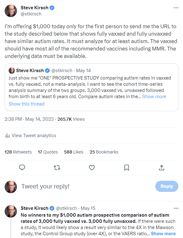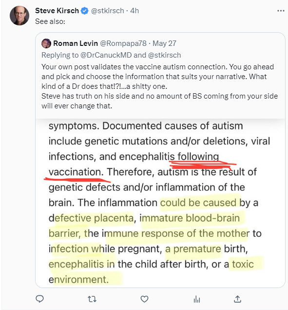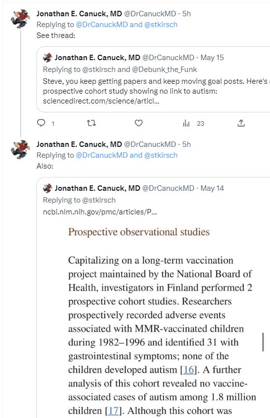 I pointed out his tweet about my papers showing the autism link did in fact show the link as I claimed when I posted the links. Then he does what most people do when called out: changes the topic!