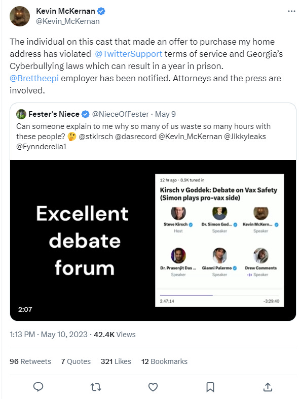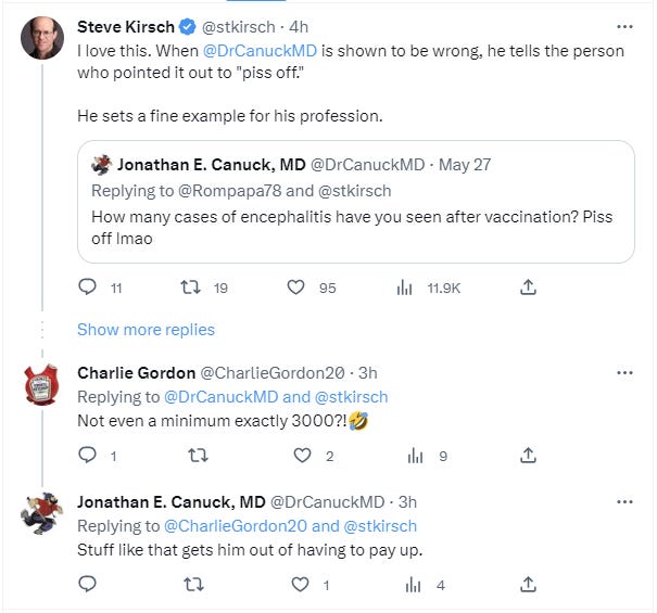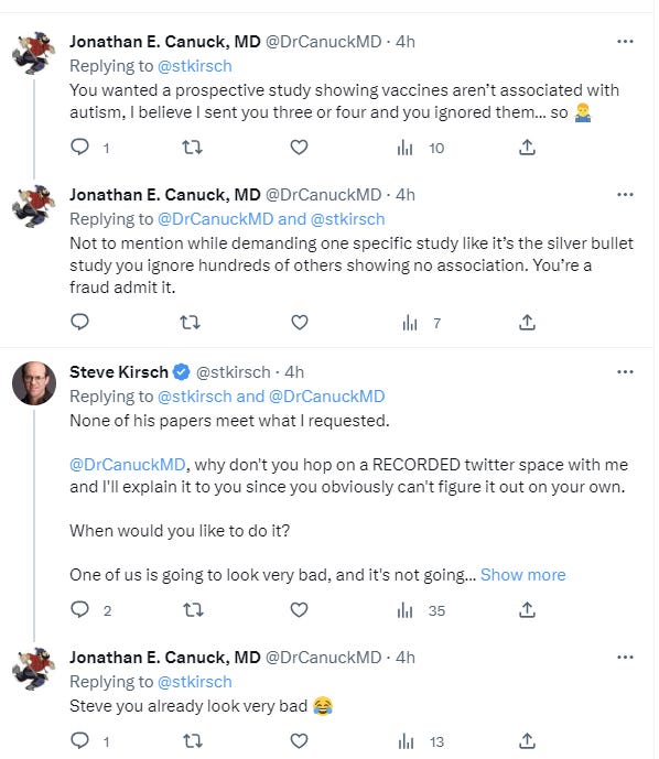 Steve is a great man but there are people listening to this guy. I have only written a few Substack posts and I’ve never sent them out to my list, but I wrote one about this doctor, who sends his followers after us to falsely accuse us and get us permanently banned. He has them fled to the page, trolls, and mass report and I was banned after 14 1/2 years on Twitter. For using the word cretin in a sentence. Not even calling anybody one. He’s been defending people for years. I’m glad somebody is finally taking him to task.