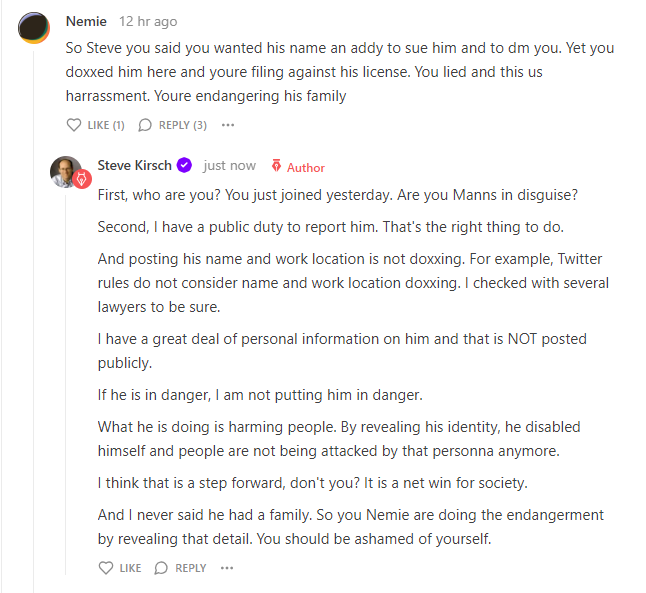 If you try to contact Manns, he’ll ignore you, and you’ll get a nastygram from his attorney explaining all the bad things that will happen to you if you if you try to sue him for defamation (anti-SLAPP, etc). It’s pretty much all bullshit because if you’ve been defamed with malicious intent, anti-SLAPP motions don’t fly.
