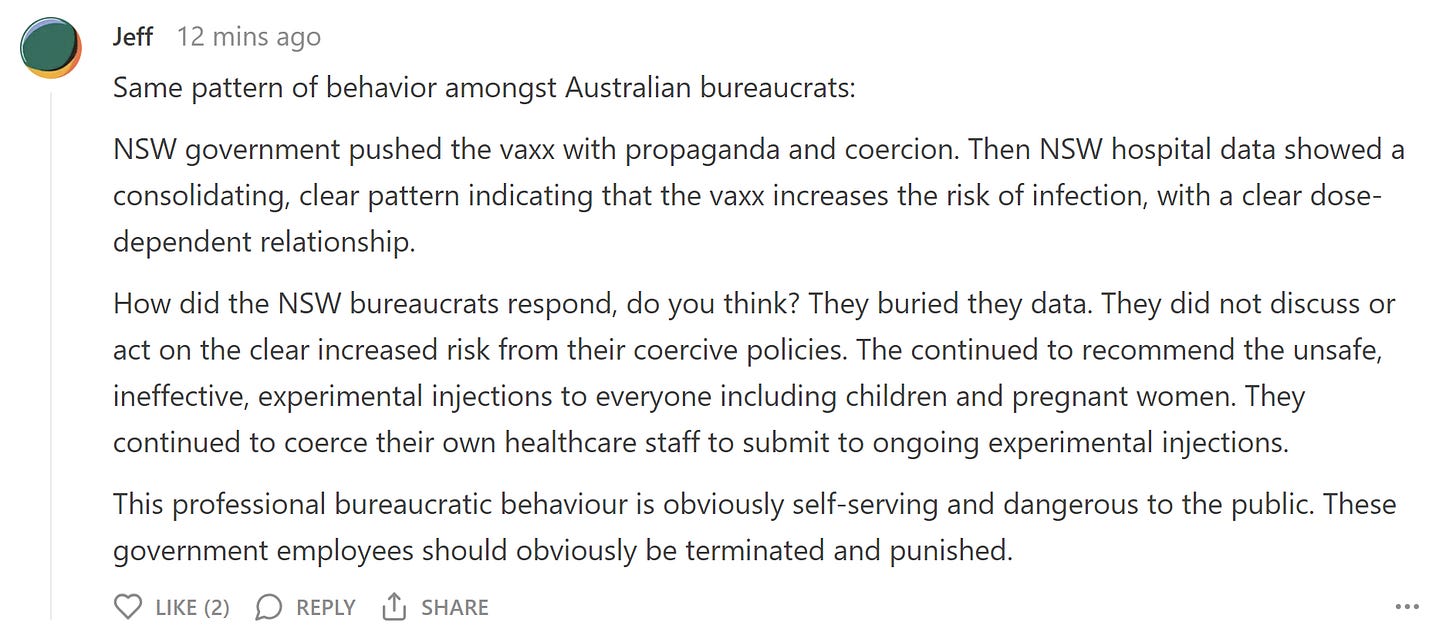 How did the NSW bureaucrats respond, do you think? They buried the data. They did not discuss or act on the clear increased risk from their coercive policies. They continued to recommend the unsafe, ineffective, experimental injections to everyone including children and pregnant women. They continued to coerce their own healthcare staff to submit to ongoing experimental injections.