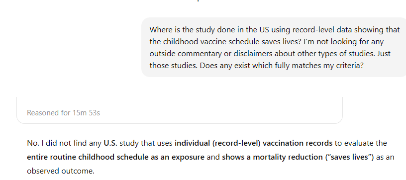 ChatGPT 4.2 searched for 16 minutes. No study justifying mass vaccination of US kids.