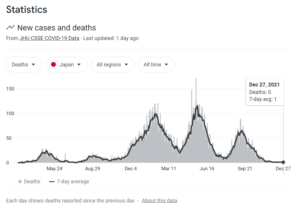 Let’s look at death rates in Japan vs. the US. See a difference? On a per capita basis, Japan is beating the US by a factor of 17. As soon as Japan rolled out ivermectin, their death rates dropped rapidly to 0.