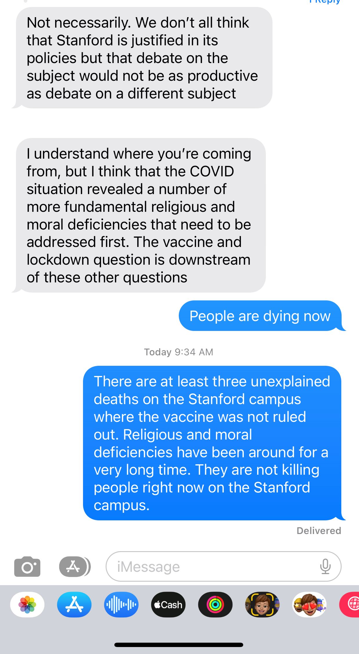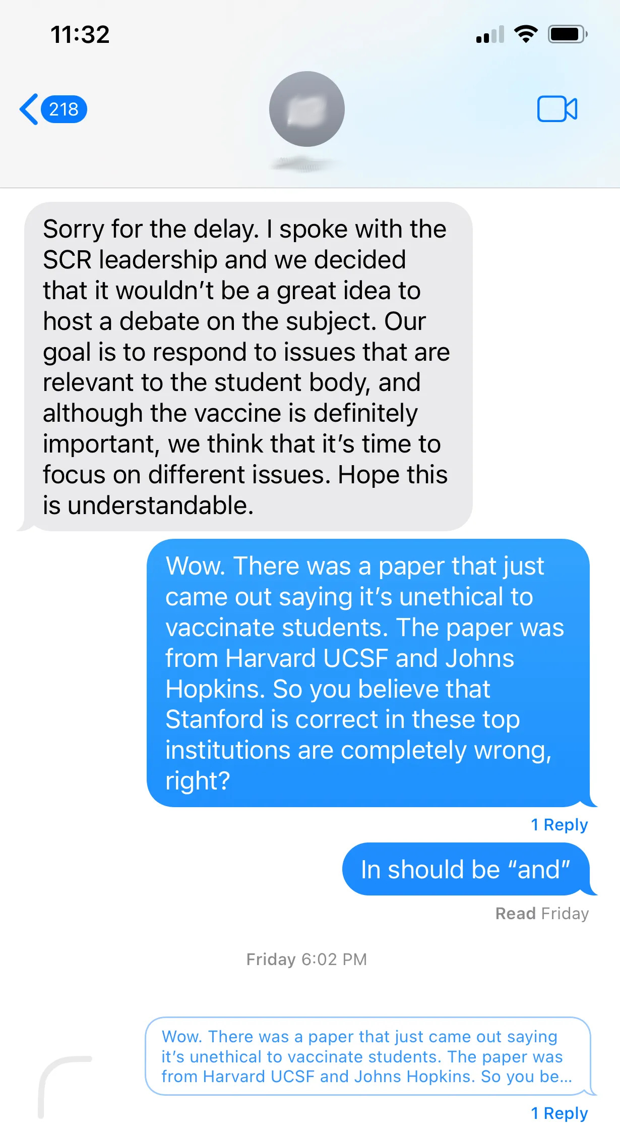 Here is the full text message conversation I had with a Stanford student who made inquiries as to why there are no debates on the Stanford campus about the vaccination policy.