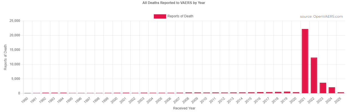The CDC seems not to look at their own safety monitoring system VAERS. I did a recent analysis of VAERS death reports for kids under 18 and found that 75% of the deaths were “highly likely” or “likely” to have been caused by the vaccine. In what kind of society is that acceptable? Here are the death reports to VAERS over the last 35 years. Do you see a safety signal? The CDC does not. This is not due to “over-reporting” as some have speculated because the deaths analyzed were deemed to be causal, not coincidental and unrelated.