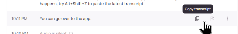 The transcript is there in the app and you can click on it and then hit your paste command (Control-v in Windows), to paste the text.