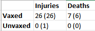 In addition, the people who were unvaccinated had a much lower rate of injury/death (25X for the injuries; 20X for the deaths).