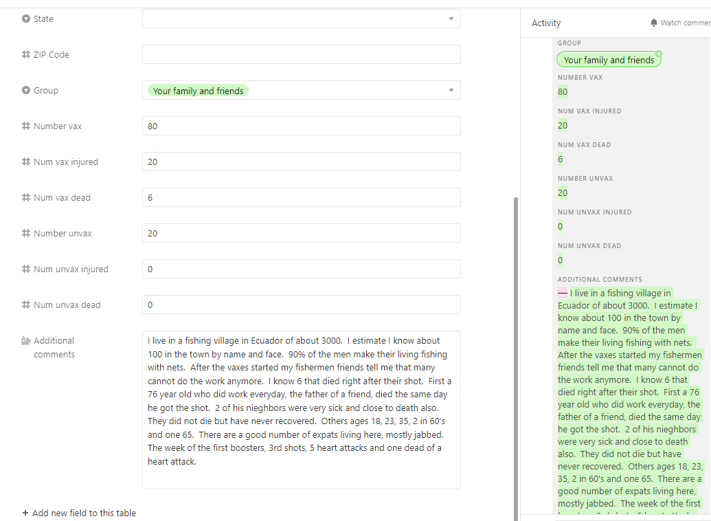 I live in a fishing village in Ecuador of about 3000. I estimate I know about 100 in the town by name and face. 90% of the men make their living fishing with nets. After the vaxes started my fishermen friends told me that many cannot do the work anymore. I know 6 that died right after their shot. First a 76 year old who did work everyday, the father of a friend, died the same day he got the shot. 2 of his neighbors were very sick and close to death also. They did not die but have never recovered. Others are aged 18, 23, 35, 2 in their 60's and one 65. There are a good number of expats living here, mostly jabbed. The week of the first boosters, 3rd shots, 5 heart attacks and one death of a heart attack.
